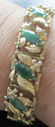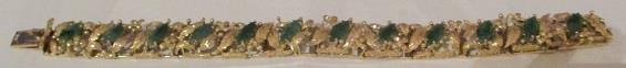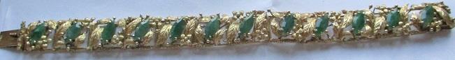 14k yellow gold bracelet with 12 marquise cut jadeit(?) ca 10-11,5 mm. Total weight 35,6 grams. Takst-valuation N.kr. 35 000