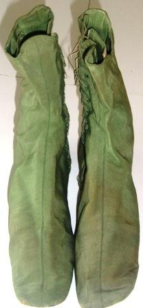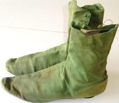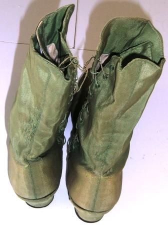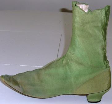 A pair of 1860-70 green silk shoes. The shoes have side lacing.