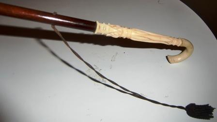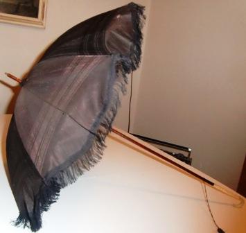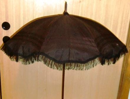 M34M 1870 or older Brown Silk Parasol with fringe and ivory handle in very good condition.