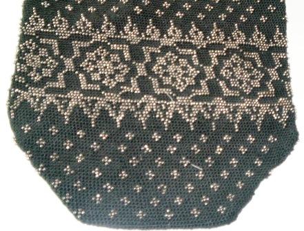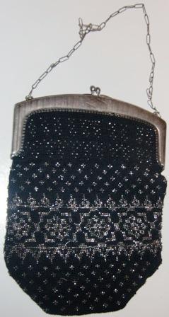 Knitted purse in black and silver with silver handles.