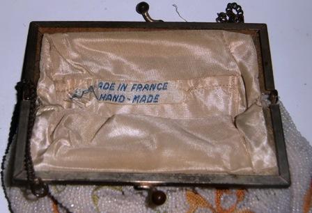 M58M French Tambour Embroidery Handbag. It is made in France 1920-30 with white beads surrounding bow and floral embroidery. metal frame and chain. In mint condition. L