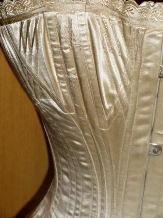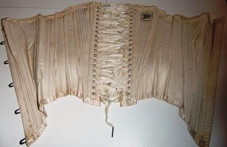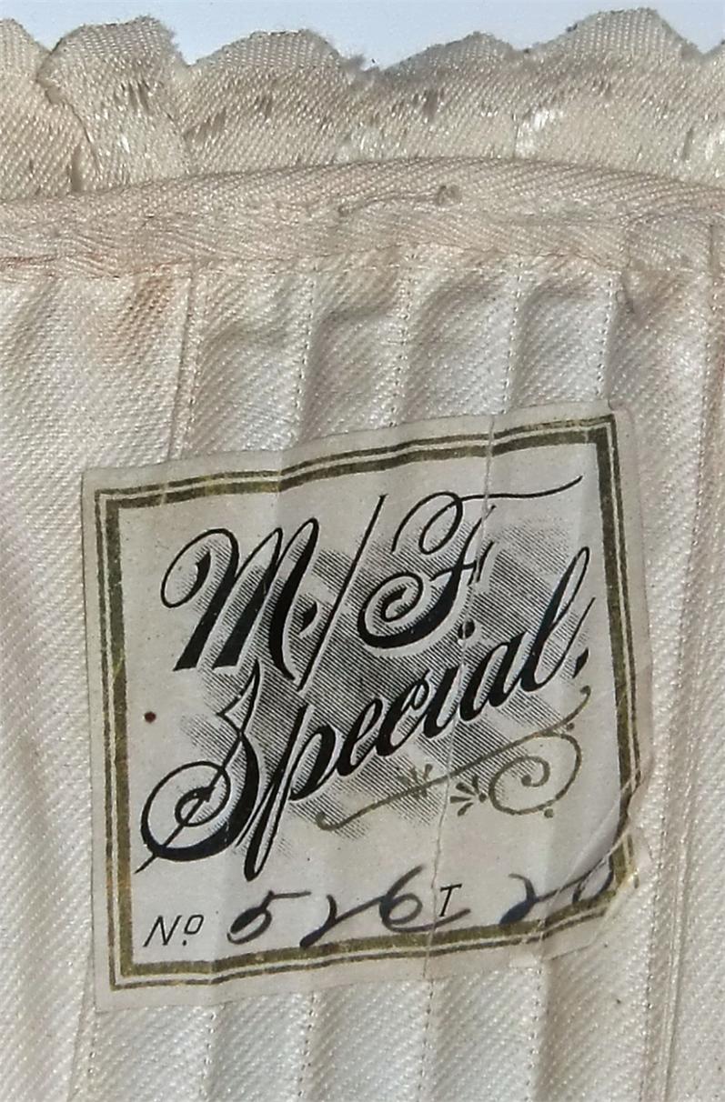 M89M ca 1883-84 White sateen Wedding corset. This is a wonderful corset. In fact the best i have from the period 1870-1901. It is in white sateen with embroidery and lined inside of thick white cotton. It has a label who reads M/F Special and a number. It is in mint condition.