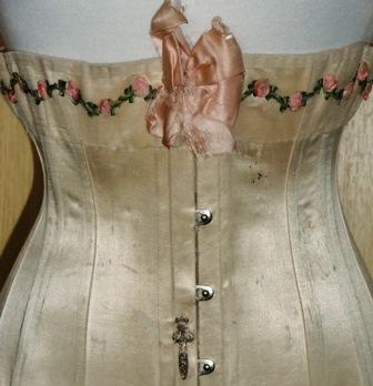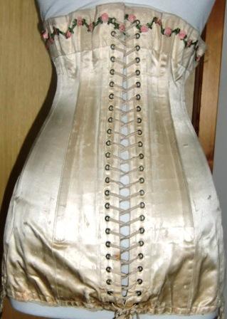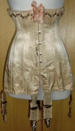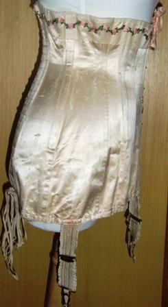 xxA wonderful corset from 1910. It is in shiny white silk and is decorated with tulle and silk flowers. Which leads me to believe that there may have been a wedding corset. There are traces of a trade mark but it is now so obscure that I can not read it. This is a beautiful corset, high class in excellent condition.
