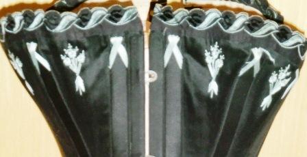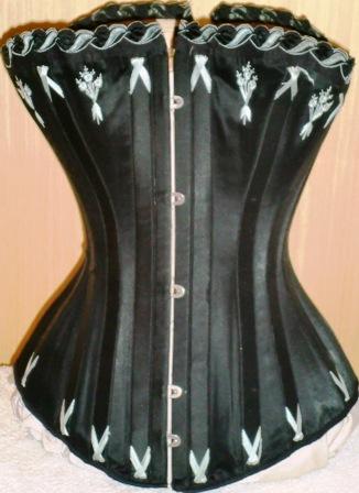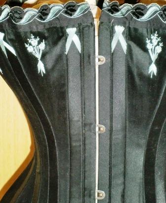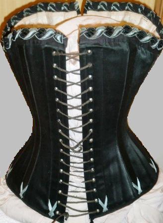 xxThis is a great W.E. Watch Spring No.2 Corset. It is made of black silk with shiny blue flossing. Matching blue and black scalloped trim decorat the top of the corset. Boned with watch spring. It is made in England around 1895-98. It is in very good condition.