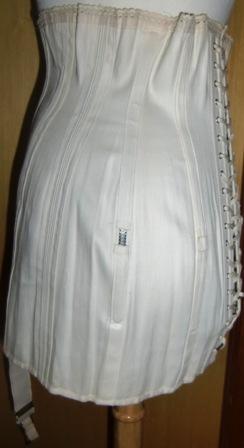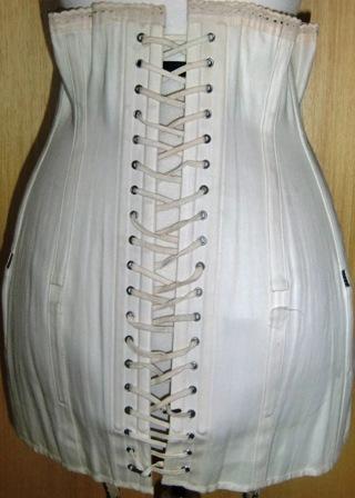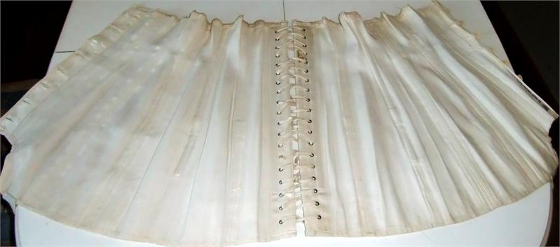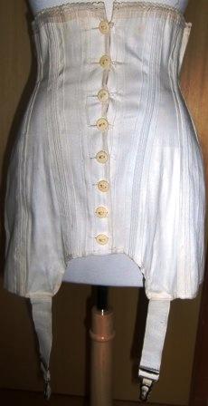 Corset in thick woven cotton with mother of pearl buttons and two stocking straps.