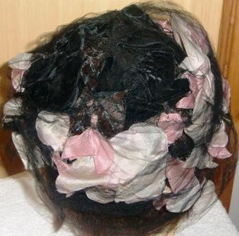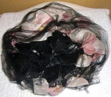 Hat with netting and flowers.