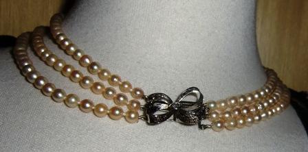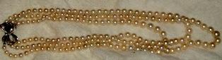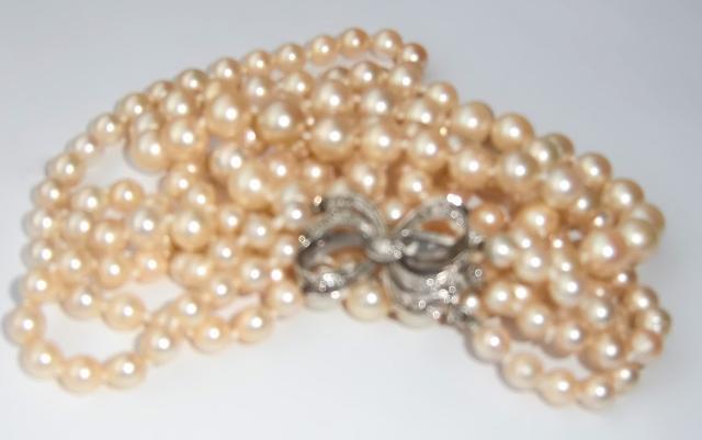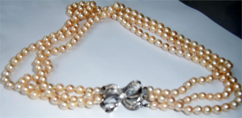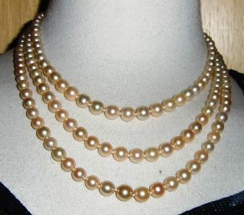 M147M Early 1900 3 Stands pearl necklace. Here is an absolutely exquisite antique Edwardian ocean Pearl necklace ca 1910. It has 3 stands of Japanese Akoya ocean water Pearls. This is a necklace of quality and truely antique. The pearls are in cream golden with a gorgeous Lustre. They graduate from 56 pearls 4,8 -7,8, 63 pearls 4,8 -7,8, 69 pearls 5,2 - 8,2 mm. This come from a fine estate . The color is a Luscious creamy golden as can only be found in antique pearls. The clap in gold with a Diamond in its center and 9 small diamond around. The necklace was just restrung on knotted silk tread. It is in Mint condition.
