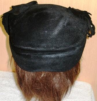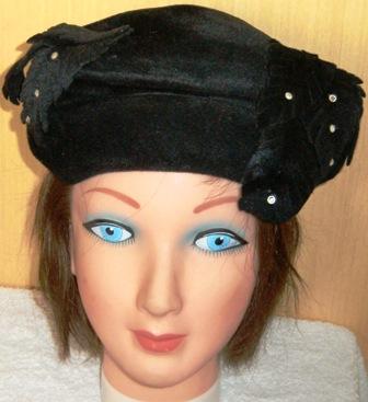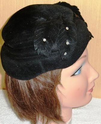 Original great design by Christian Dior. This hat is from the late 1940s and is a vintage size 22, wool, with a a bit of a sheen. Embellished with six large leaf pedals that drape toward the front of the hat with scattered rhineshones. Pedals are also fringed for texture. This is really such a bewitching hat, great condition, deep black in color, but I have lightened some of the photos to show the great detail. Sculptured design around the brimless crown. Slouch fold all around..great hat! Christian Dior, who lived from 1905 to 1957, was founder of one of the worlds top fashion houses. Born in France, died in Italy and designed for celebrities and world leaders.