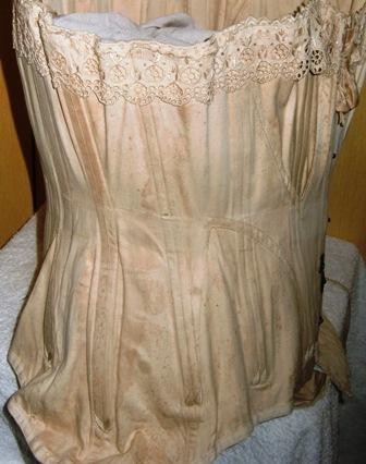 M98M ca 1898 French Corset. Corset in cotton cream made around 1898-1900. A working class corset. Some spots here and there.