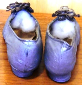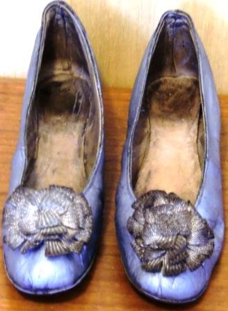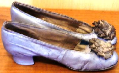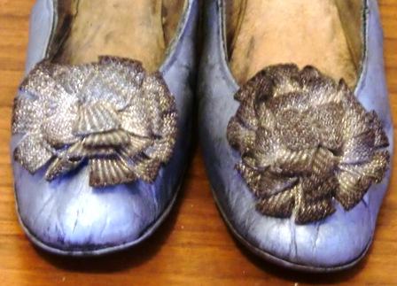 These exquisite ladies´shoes are attractively made of fine silver kid leather with silver metallic thread rosettes on the vamps. The shoes are lined in tan leather and cotton twill at the toes (there are rests of blue silk that should have covered the cotton twill), and they have 1" wooden stacked heels. Slightly crooked soles of brown leather.