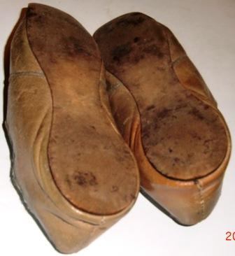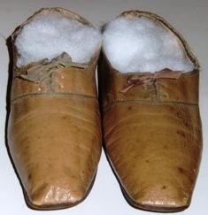 Shoes dating to around 1790-1810. They are made of a pumpkin-colored