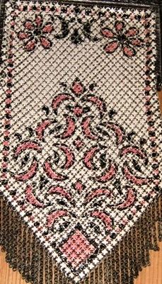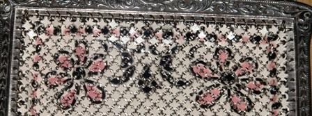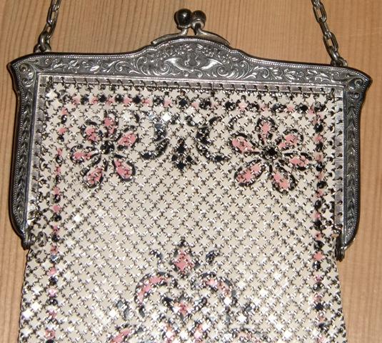 THIS GORGEOUS HAND PAINTED ENAMELED MESH PURSE. MADE BY MANDALIAN MFG.CO. DURING THE DEPRESSION ERA. THE CREAMY BACKGROUND IS COMPLIMENTED BY A PINK AND BLACK ART DECO DESIGN. A TRUE BEAUTY. THE PURSE MEASURES APPROXIMATELY 7.5" FROM CLASP TO BOTTOM FRINGE. THERE ARE NO SEPARATIONS OR DAMAGE TO THE MESH. THE FRAME IS A SILVER TONE WITH MANDALIAN MFG.CO. STAMPED ON THE INSIDE. THE CLASP OPENS AND CLOSED WITH A SNAP.THE FRAME IS ALSO GOLD TONE WITH A SOFT SCROLLING DESIGN. L This eyecatching and collectable item bears the name of one of the most renowned makers of mesh bags - the Mandalian Manufacturing Company. The company was founded by Sahatiel Gabrabed Mandalian, who was born in Turkey in 1869, and who emigrated to the United States of America in 1889. After settling and marrying in North Attleboro, Massachusetts, Mandalian formed a business partnership, and the company (called Casper and Mandalian after its owners) initially made jewellery. Following a change of partner and name (to Mandalian & Hawkins) in 1906, the company began to specialise in the manufacture of mesh bags. By 1915, Mandalian & Hawkins was one of the most important mesh bag producers in America; it was in this year that Mandalian purchased his partner's share of the company, which then became known as the Mandalian Manufacturing Company. The company took pride in adopting innovative design and production techniques for its mesh bags, with the aim of delivering high quality items. Its bags tended to be decorated with ornate and colourful floral motifs, or alternatively, patterns reminiscent of those seen on Turkish carpets (inspired by the owner's heritage). Mandalian produced mesh bags only for a relatively short period, and the company was sold to the leading American mesh bag maker - Whiting & Davis - in 1944. Its founder died five years later