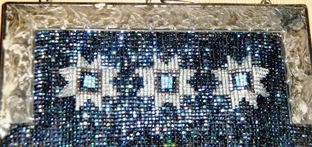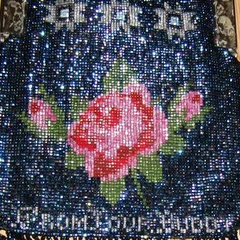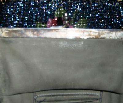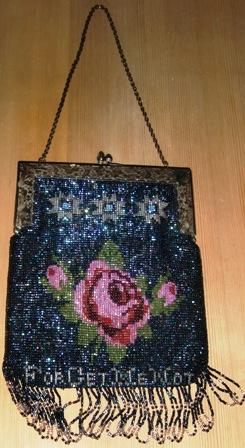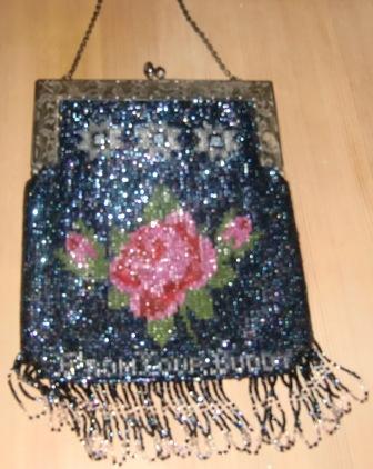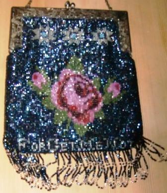 WONDERFUL RARE BEADED VICTORIAN PURSE WITH ACORN CLASP CIRCA AROUND 1850'S.." VERY UNIQUE " IT A BLUE BACK GROUND WITH BEAUTIFUL RED AND PINK ROSE'S GREEN LEAVES,SILVER STARS WITH A LITTLE LIGHT BLUE IT IS DOUBLE-SIDED.. WRITTEN ON BOTTOM ON ONE SIDE IN SILVER SAYS " FOR GET ME NOT " ..ON OTHER SIDE IT SAYS " FROM YOUR BUDDY" ..METAL FRAME ETCHED FLOWER DESIGN (COULD BE SILVER PLATED BUT I JUST DON'T KNOW) .IT IS LEATHER LINED SOFT LEATHER.MEASURES WITH HANDLE 17" LONG 6" ACROSS FRAME JUST THE PURSE WITH OUT HANDLE OR FRINGE IS 8 1/4 FROM CLASP.. THIS IS HEAVY BEADED PURSE ..IN GOOD OVERALL CONDITION..THERE IS 2 MISSING HANGING FRINGES AS YOU CAN SEE IN PHOTOS CLICK ON ENLARGE TO GET A GOOD LOOK OF CONDITION... L