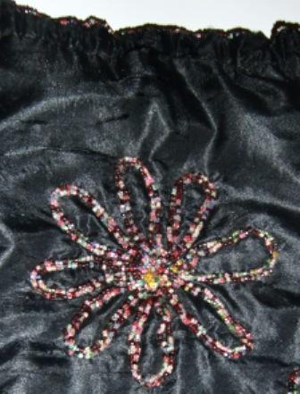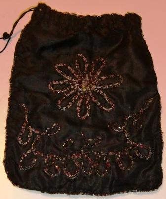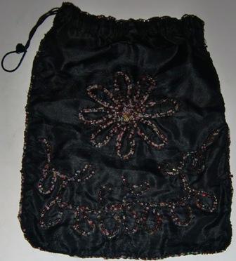 Measures 12 x 8.5" and is hand beaded with colorful glass beads. The beading makes this black silk - heavy lined purse heavy. Inside the purse it is a flower embroidery bery nice