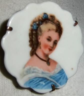Hand painted Victorian Limoges cameo brooch. A finely detailed portrait of a young lady is delicately painted on a scalloped porcelain miniature charger.