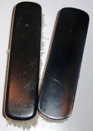 Oh this is a wonderful set. Two brushes, one box, one tray and a pair of glove stretchers. All In the fiest black ebony. In wonderful condition consummate for their age 1880s .