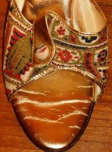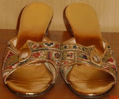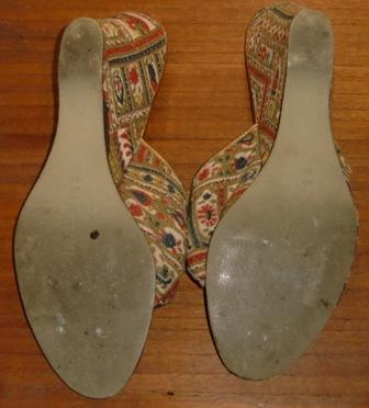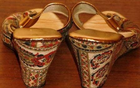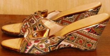 xxM348M 1950s GOLD & FABRIC DELISO WEDGIES SLIPPERS 7 Adorable and unique 1950s Deliso wedgie slippers. These have gold metalic vinyl insoles and trim on nubby fabric heels and uppers. The gold trim is folded over on the sides and accented with a cute fabric button. Fabric is very 50s olive gold, black and orange/red print on cream. So nubby it almost eleeds like barkcloth. The first D and e of the Deliso logo shows on the insole of the right slipper. The rest is worn off but you can see these are Delisos. Condition is very good.