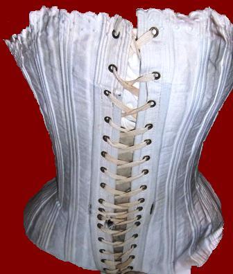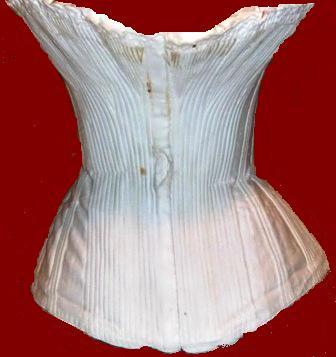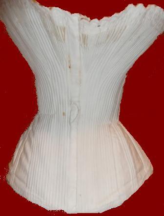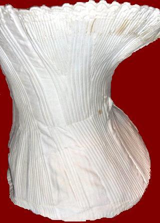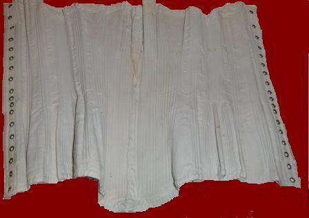 1860 white cotton woven corsets. Woven corsets are a mid 19th century phenomenon as they allowed manufacturers to weave a corset on a loom and simultaneously add in the boning. This particular corset is styled with an older 1840's and 1850's shape with a buskless front and a full, flared fan shaped bust. The bust and hips have boned, trangular gussets for maximum shaping and is typical of early Victorian corsetry. Later 1860's corsets start to move away from gusseting for figure shaping when manufacturers start cutting corsets in pre- shaped pieces.