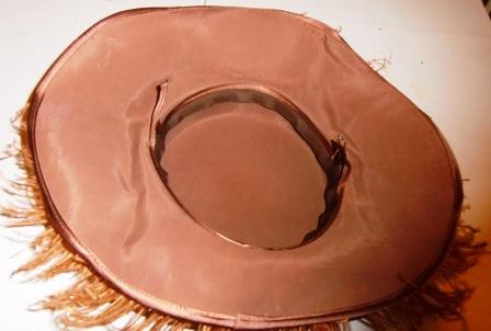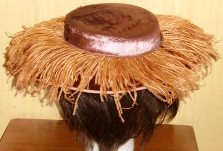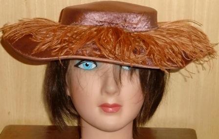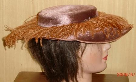 VINTAGE VELVET WIDE BRIM HAT FEATHERS ALL AROUND THE BRIM HERE IS A GREAT EARLY HAT. IT IS VELVET WITH FABULOUS FEATHERS COVERING THE WIDE BRIM. WHAT A HAT! CERTAINLY A SHOWSTOPPER. THIS IS A VERY FINE HAT, CRAFTED SKILLFULLY. THIS HAT IS MADE OF SOFT VELVET IN A MUTED PINKISH MAUVE COLOR WITH ORANGE UNDERTONES. THE FEATHERS ARE A COORDINATING MORE VIBRANT COLOR. I LOVE HOW THEY ARE NOT THE EXACT SAME COLOR. THIS WAY YOU REALLY SEE THE FEATHERS. THE BRIM IS 4” LONG ALL AROUND. THE INTERIOR CIRCUMFERENCE OF THE HAT MEASURES 20-21”. THERE ARE METAL HOLDERS ON THE INTERIOR OF THE HAT TO HELP SECURE IT TO YOUR HEAD.
