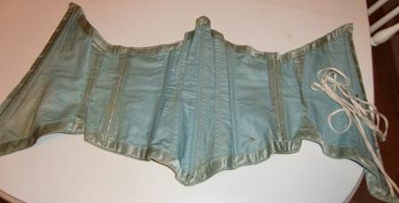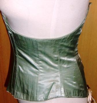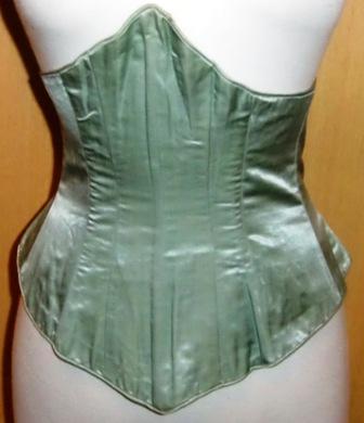 M355M 1860s green satin corset/waist. This magnificent corset in green satin made ca 1860. This type of corset without hitches in front and with lacing in the back was common before 1870. This hand-made corset is in excellent condition. It has balusters of whale bone and is lined inside.