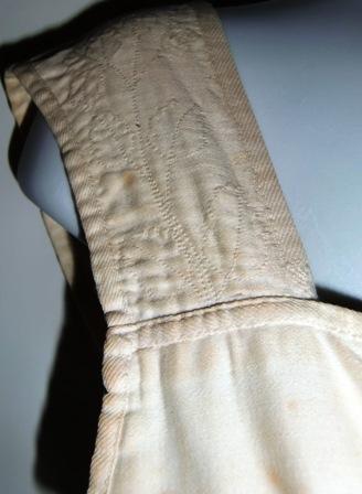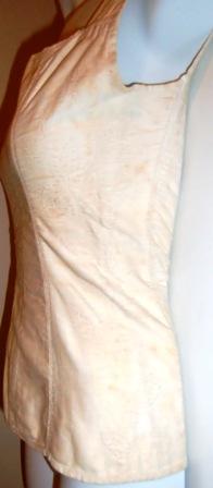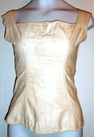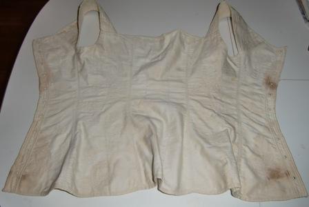 XXThis is a bridal corset from 1820. It is in white silk lined with white cotton. It has white stitching embroidery. It has had the corset shrub, but it has now gone. The corset has several age spots which degrade the corsets conditioning. I hope someone can help me with the spots. It will then be in good condition.