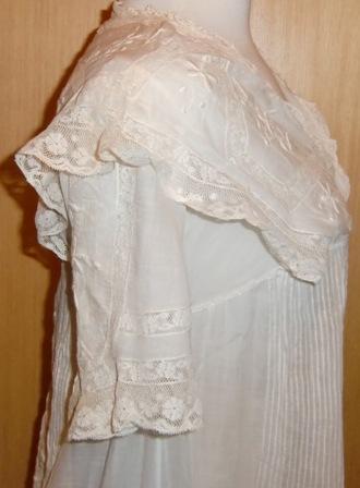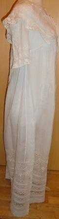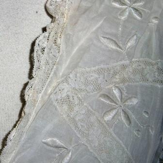 Much beauty of the piece. Exquisite white cotton batiste dressing gown with lace insets and embroidery.