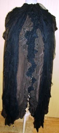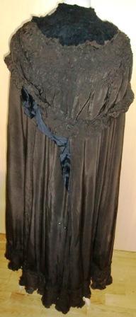 Overall condition is good. The silk is in good condition except for a 2" mend at the right breast. There seems to be a bit of ribbon detailing/trim on the right side of the hood (if you're looking at the cape from the back) that is missing.