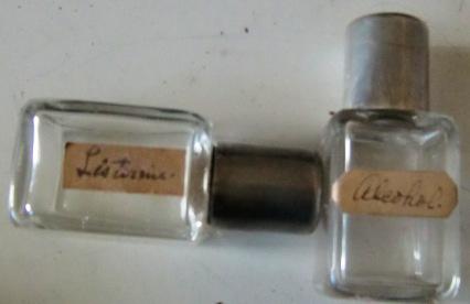 The pieces have the monogram "M.B.". The lids on the 2 glass bottles,