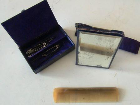 outside with a purple lining. On the back of the mirror is written 2 May 1909 and 1919, I can not see what.