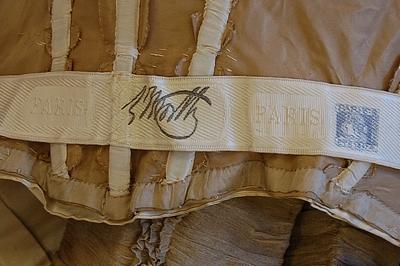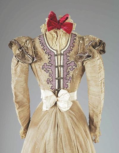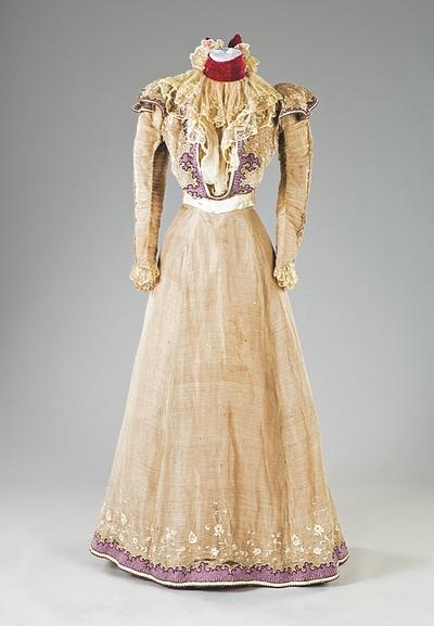 xxA rare Maison Worth summer gown, 1897, labelled and numbered 91416, with blue art-nouveau stamp to the ivory petersham waistband, the bodice and skirt of ecru silk organza spangled with gold sequins, edged with lilac felt and embroidered in white cotton with delicate trailing blooms, the bodice back fastened with flounced shoulders, ivory satin waistband and collar (later added crimson velvet neck-band), the front of the bodice with curved pouch inset with chiffon and lace jabot, tightly ruched and gathered sleeves, integral underskirt of beige taffeta, bust 81cm, 32in, waist 56cm, 22in (2) This gown was designed by Jean-Phillipe Worth who took over as designer for the house upon his father's death in 1895. The blue stamp is found on only the Summer and Winter 1897 collections. It was not used for the demi-collections. Provenance: From the collection of the late Mary Wild A.R.C.A, costume designer, historian and collector. I bought the gown this year, so now it is in Norway. House of Worth dominated the Parissian fashions in the end of the 19th beginning of 20th century. Read my article Houte Couture 1870 - 1920.